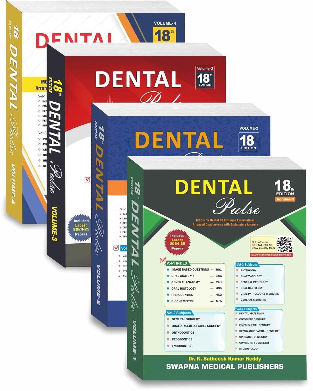 Dental Pulse is a 4-volume set compiling chapter-wise multiple-choice questions with detailed explanations. includes content for all major dental subjects: anatomy, orthodontics, pathology, oral surgery, prosthodontics, periodontics, and more
