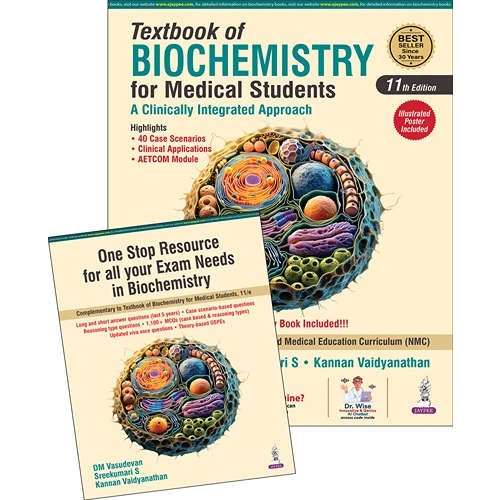 Celebrating 30 years of academic excellence, the 11th edition of this trusted biochemistry textbook has been thoroughly revised to align with the latest CBME Curriculum (2024). Designed with a student-friendly approach, it simplifies complex concepts through clear language, updated visuals, flowcharts, and clinical application boxes. Over 40 case studies with theory-based Q&As enhance clinical understanding and problem-solving skills. A complimentary booklet offers long/short answer questions, 1000+ MCQs, and viva-based content for comprehensive preparation. This edition also includes free access to Dr. Wise, an AI-powered chatbot for instant biochemistry query resolution—anytime, anywhere.